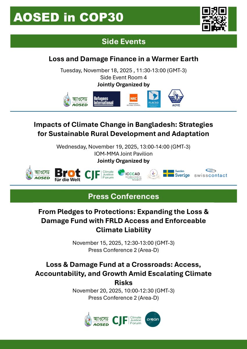 At COP30 in Belém, Brazil, AOSED is leading and co-hosting high-impact dialogues that push global attention from promises to concrete protections for climate-vulnerable communities. Through a series of focused side events and press conferences, AOSED and its partners will spotlight the realities of climate loss and damage in frontline countries like Bangladesh, and present pathways for fair, accessible, and accountable climate finance.